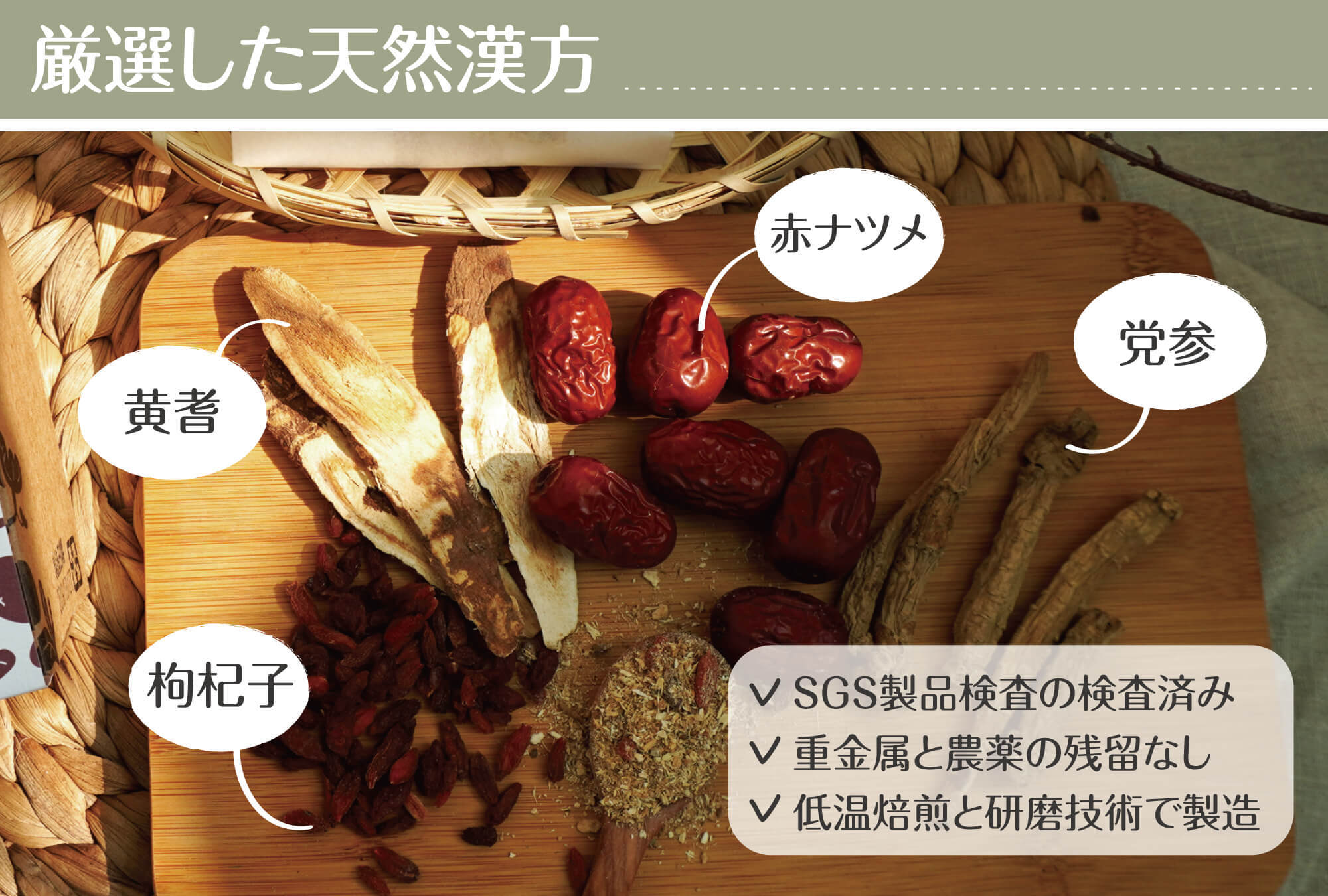 ● 成分:100% 赤ナツメ、枸杞子、黄耆、党参 厳選した天然漢方生薬を使用