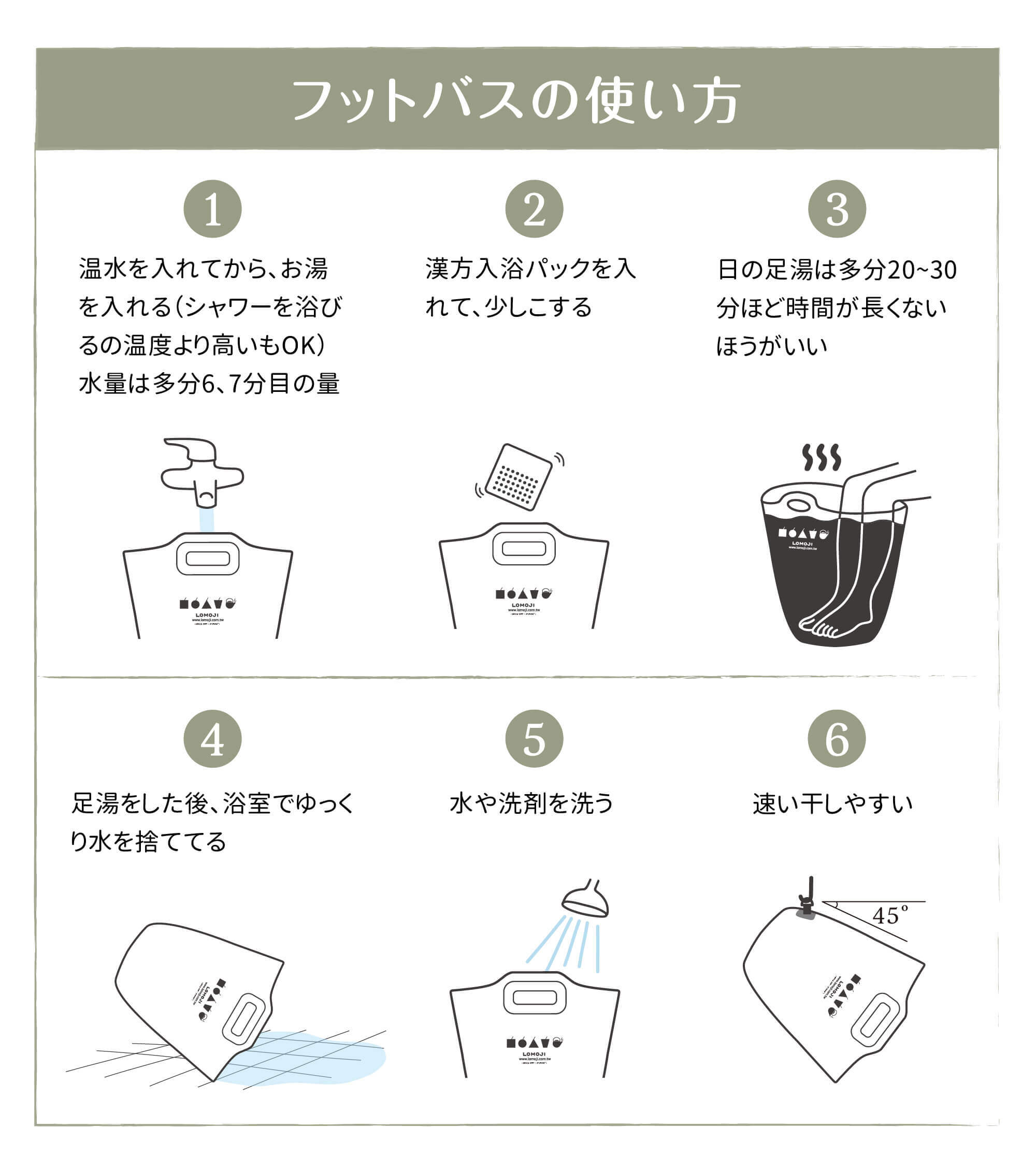 使用方法:足湯バッグの耐熱温度は70度以下です。安全に使用し、火傷にご注意ください!(熱湯を直接にフットバスに入れないでください)