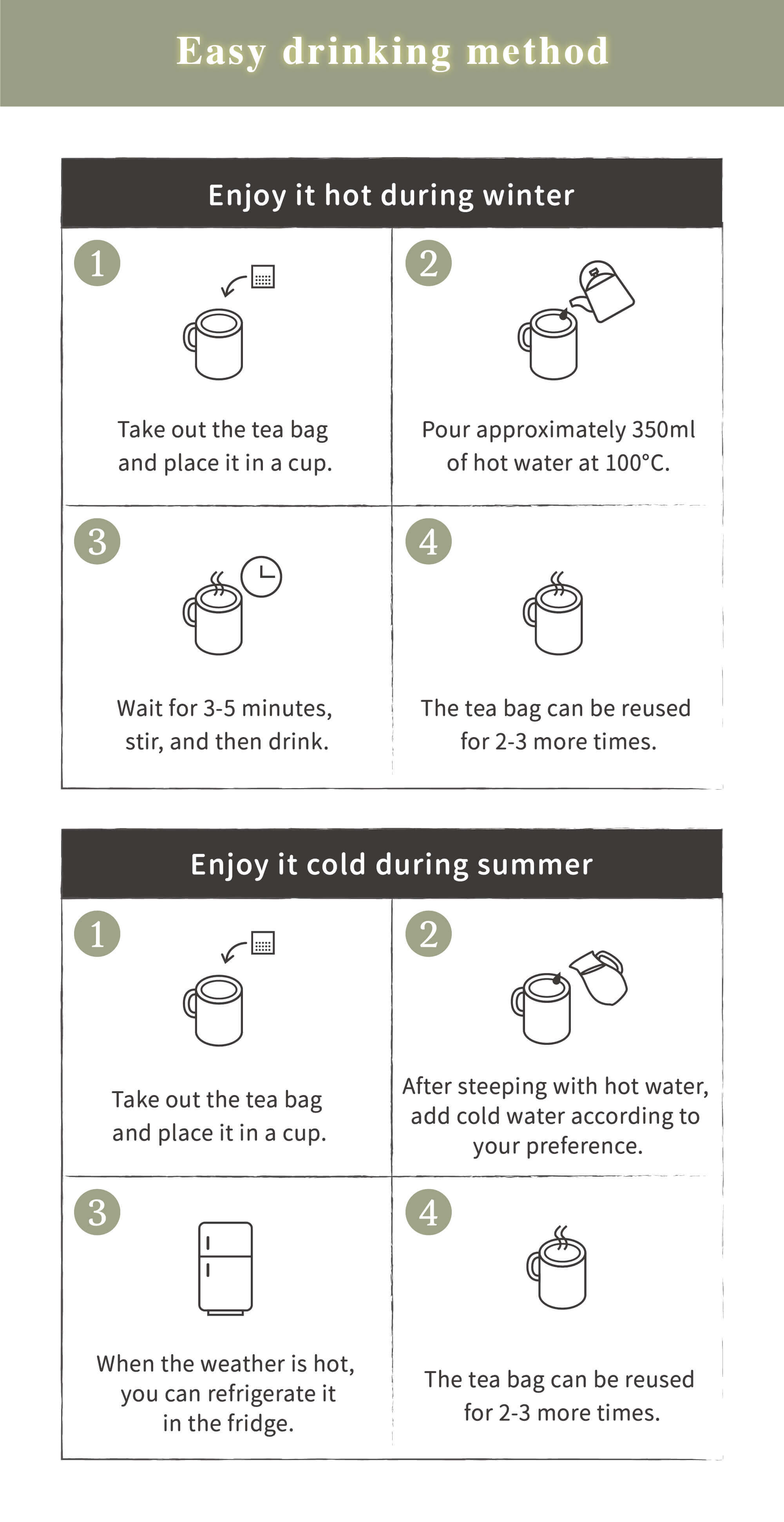 Recommended by Traditional Chinese Medicine Practitioners, Nutritionists, and Pharmacists! Long-term consumption for body adjustment.Brewed naturally in just five minutes, one tea bag can be infused 2-3 times! Two bags a day easily meet your daily hydration needs!