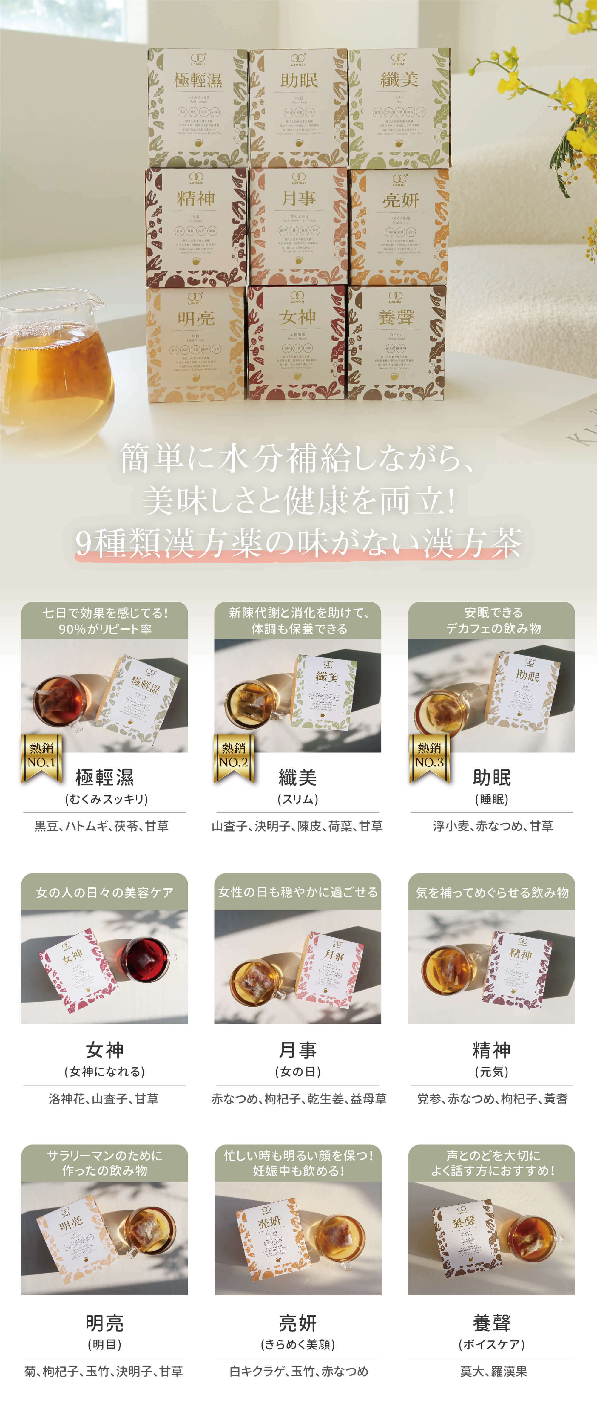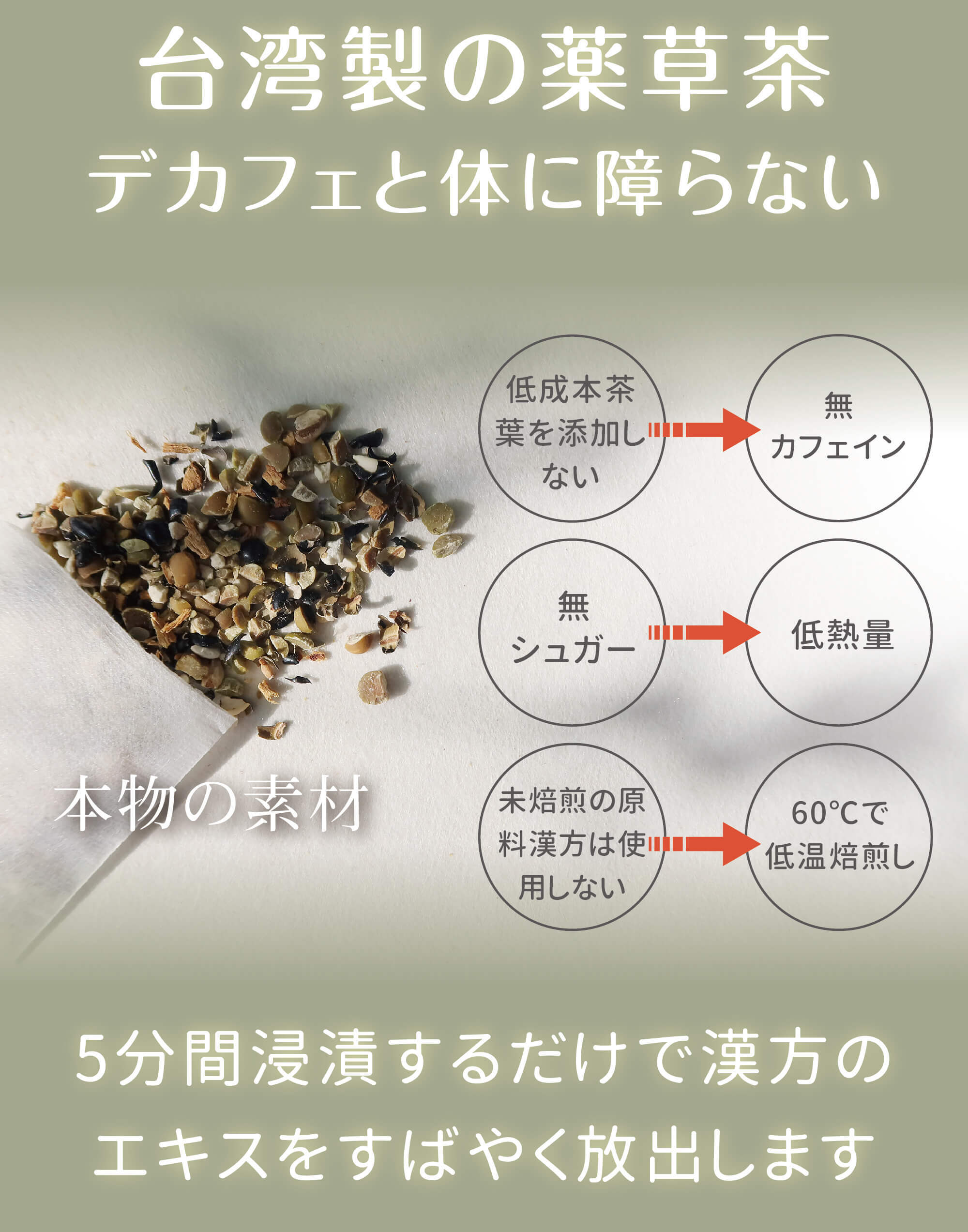• 100%天然の漢方材料、無糖、カフェインフリー、ほぼ0カロリーにこだわっています
