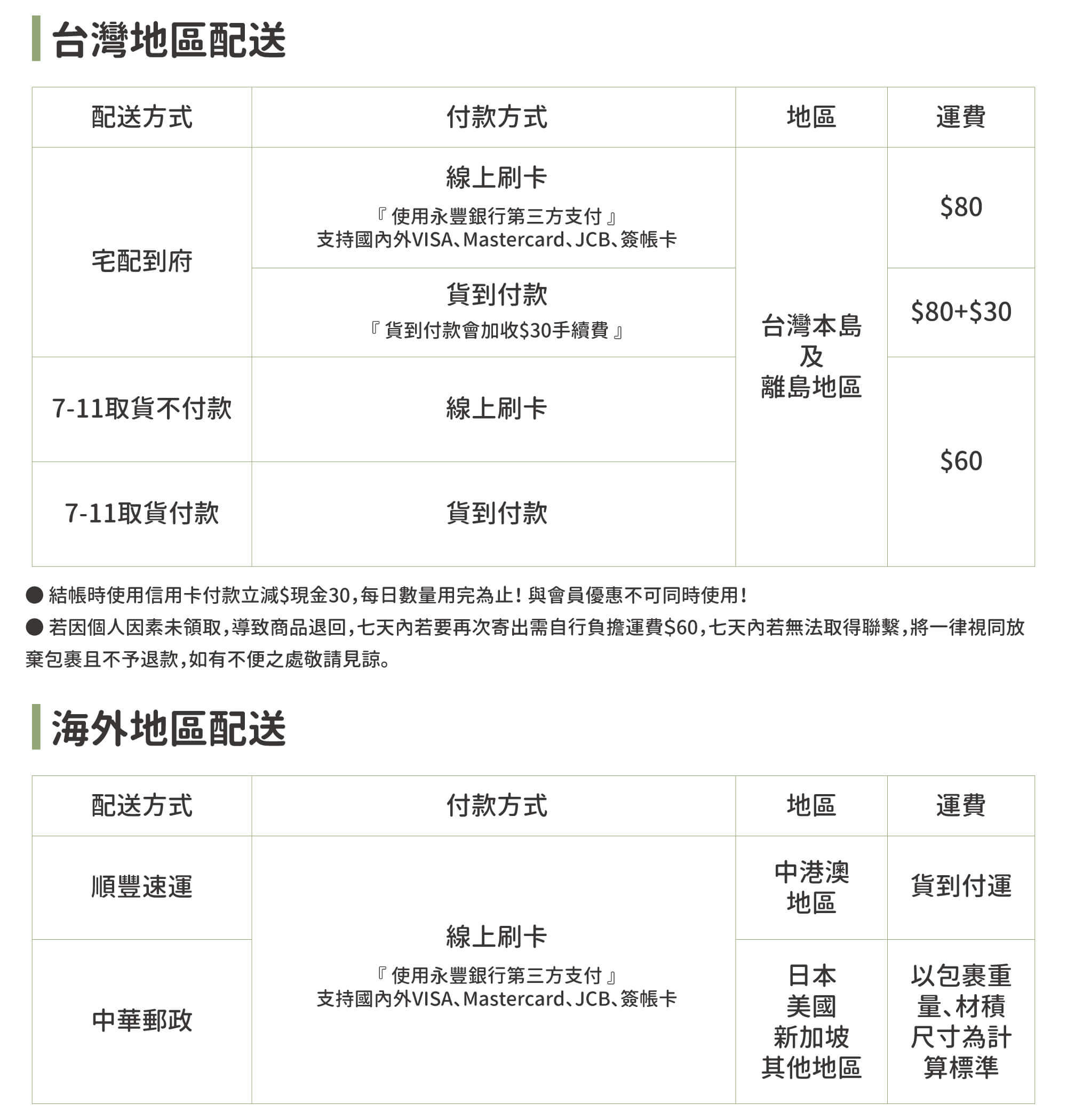 /貨到付款:宅配貨到付款(貨運收取$30元手續費)