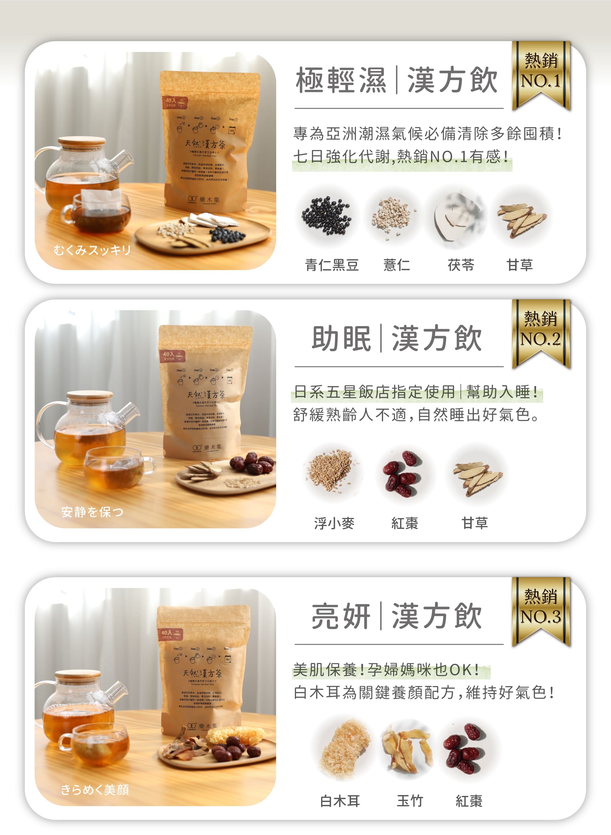 樂木集隱⾝在台北廈⾨街中藥行,傳承老祖宗的漢方智慧,在老祖宗的概念裡食物和養生是相輔相成的,「食療」是日常透過茶飲、膳食來作為平日保健養生的一種方式,但漢方茶他並不是藥,沒辦法喝一包就有成效,必須『一天』、『一點』地慢慢累積,一個養生的好習慣經過時間的複利加成,身體的改變一定會有感,100%天然漢方食材,純天然、無咖啡因、無糖,經60°C低溫烘焙研磨製成茶包,不使用任何化學方式處理,將漢方精華鎖進漢材中,免費時熬煮,五分鐘沖泡完成,每包茶包可回沖2~3次,一天兩包輕鬆補足一天喝水量,被網友評為『沒有中藥味的漢方茶』好喝到榮獲食品界米其林『頂級美味獎章,樂木集為中醫師、營養師、藥師、物理治療師一致認同,日本五星渡假酒店指定用漢方品牌,共有九款主題:極輕濕、助眠、纖美、月事、女神、亮妍、明亮、養聲、精神!