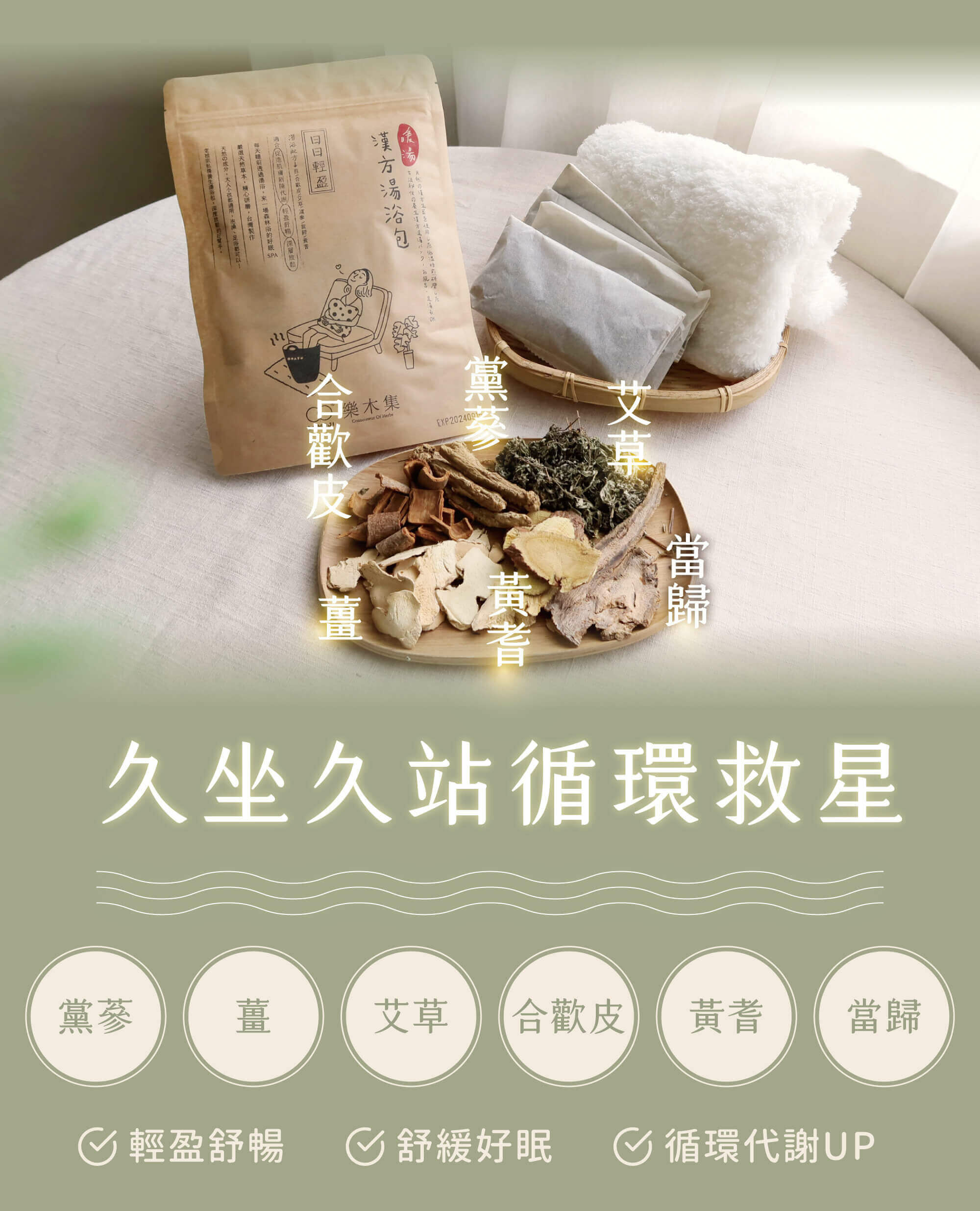 適用對象│ 忙碌緊繃、精神不濟、情緒壓力、睡眠品質不佳、不分使用年齡與膚況。溫和的草本成分友善膚質,三款皆添加艾草等穩定之漢材,『日日輕盈』特別針對想久坐久站的你,循環很差、下肢腫脹、手腳冰冷、睡眠品質不好等困擾,添加其中薑、當歸、黃耆、黨參等漢材可以幫助循環UP,合歡皮可幫助舒緩疲勞更好入睡!