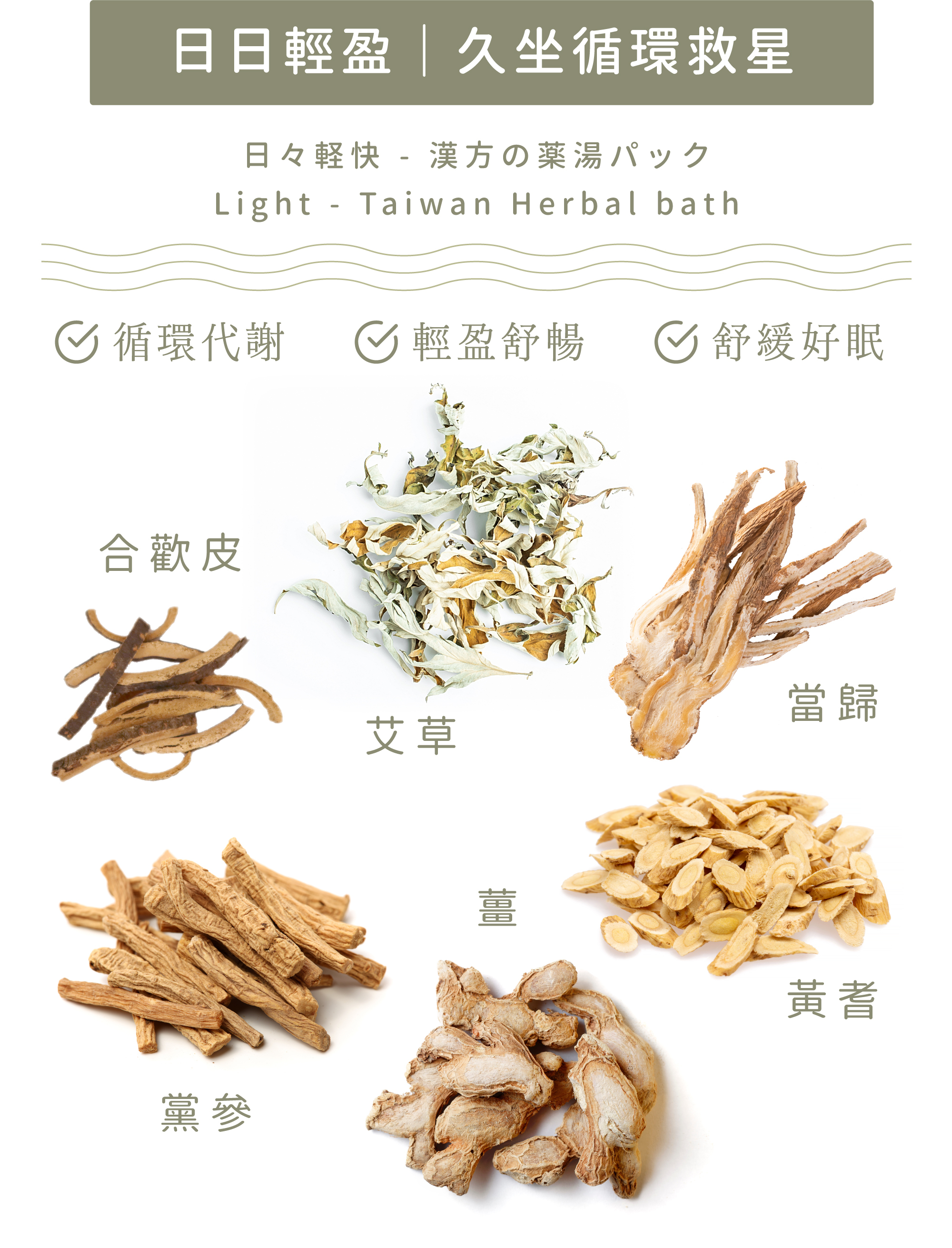 適用對象│ 忙碌緊繃、精神不濟、情緒壓力、睡眠品質不佳、不分使用年齡與膚況。溫和的草本成分友善膚質,三款皆添加艾草等穩定之漢材,『日日輕盈』特別針對想久坐久站的你,循環很差、下肢腫脹、手腳冰冷、睡眠品質不好等困擾,添加其中薑、當歸、黃耆、黨參等漢材可以幫助循環UP,合歡皮可幫助舒緩疲勞更好入睡!