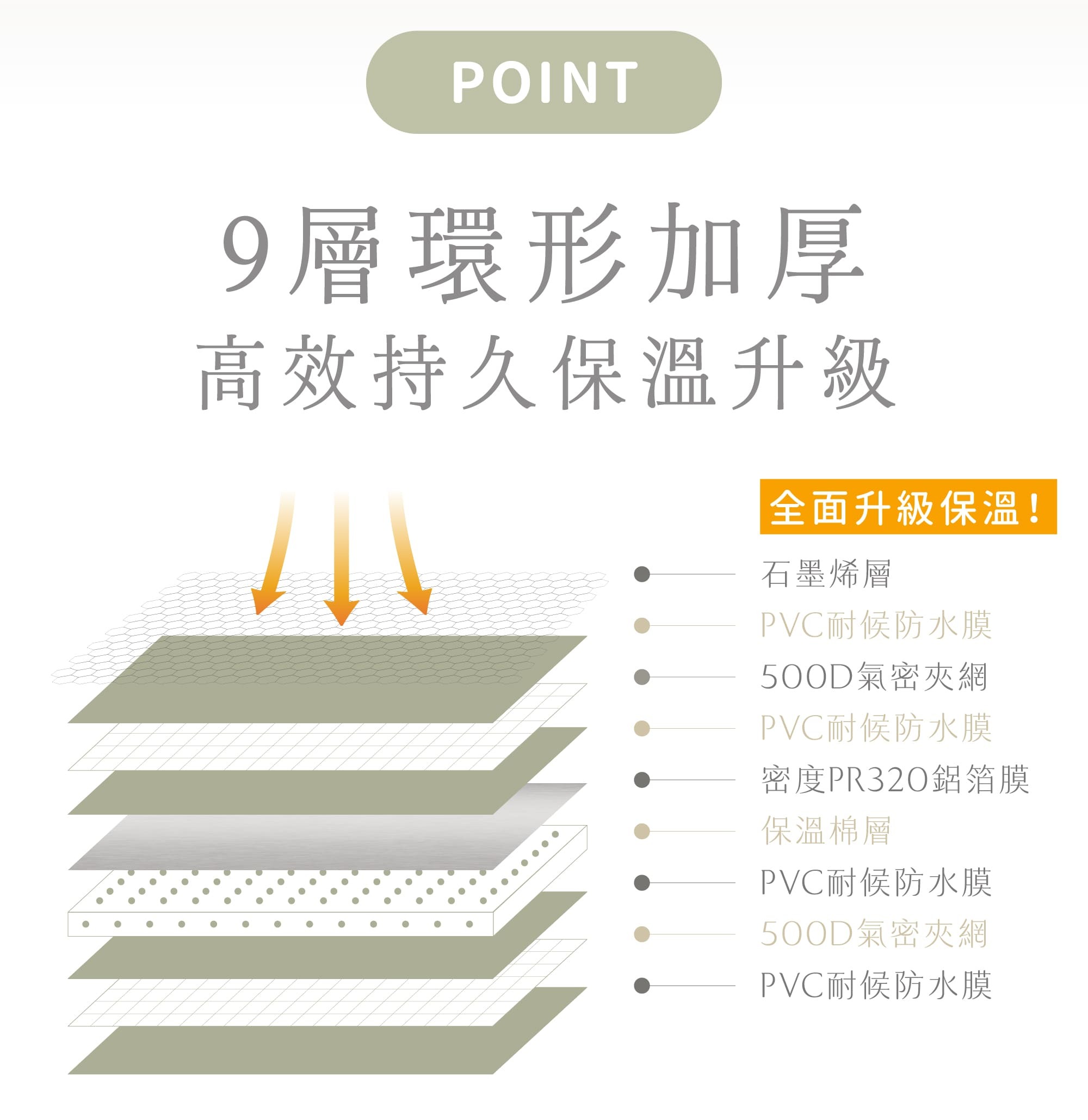 ∨ 9層加厚!上下層500D夾網PVC+石墨烯+內層鋁箔層+保溫棉,持久保溫!保暖升級!