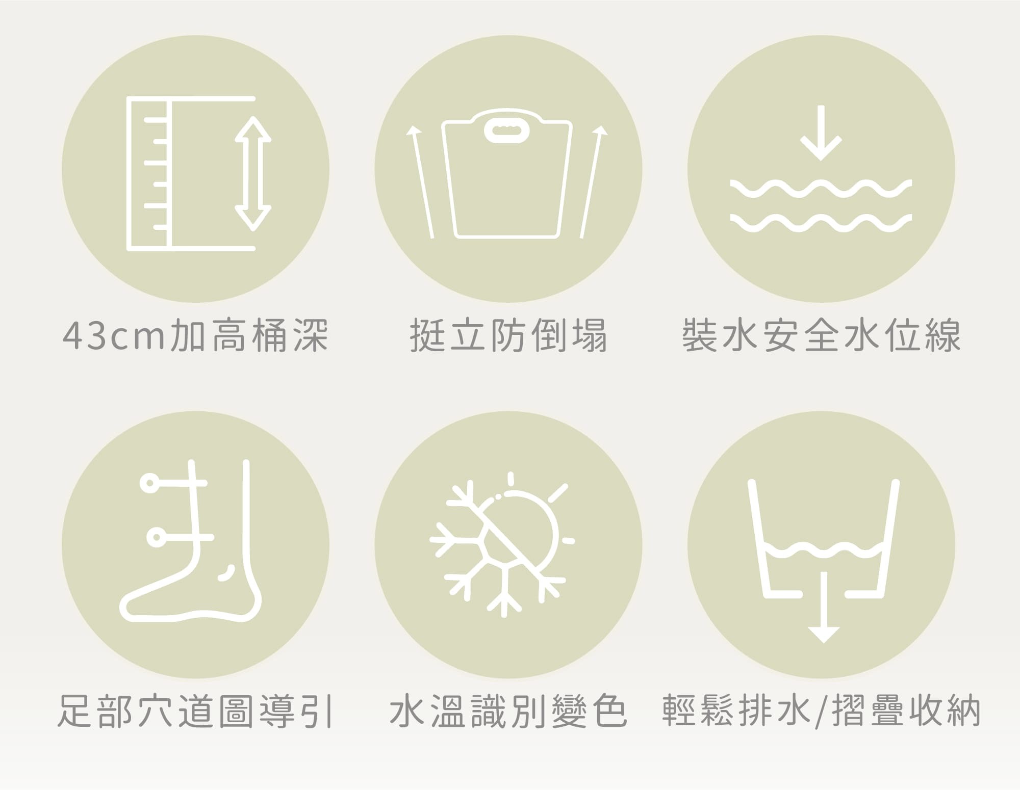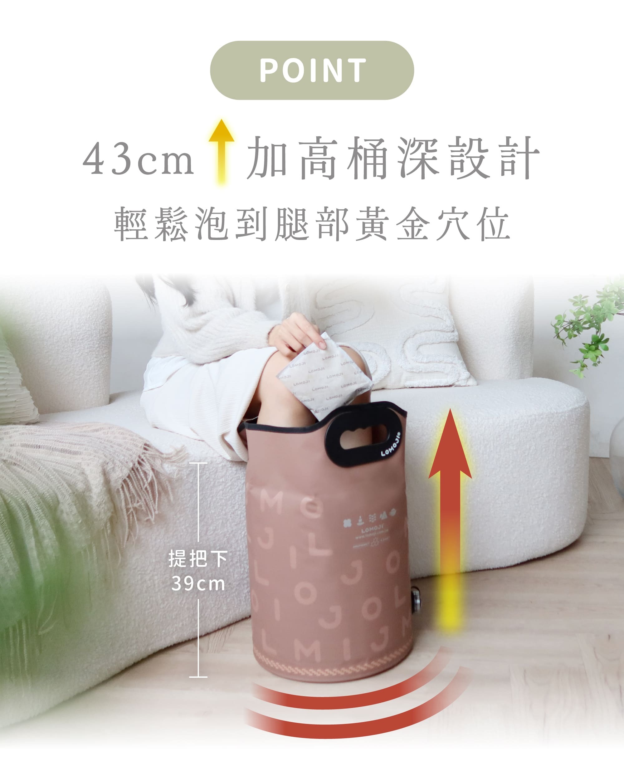 ∨ 加高桶深43公分,可泡到小腿的黃金穴位。