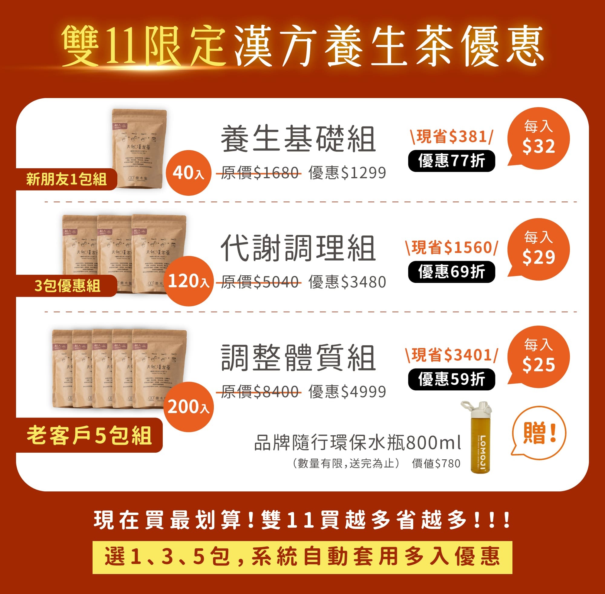指定商品,🎊雙11最優惠|任選漢方茶澎湃包,3包(120入)$3480、5包(200入)只要$4999