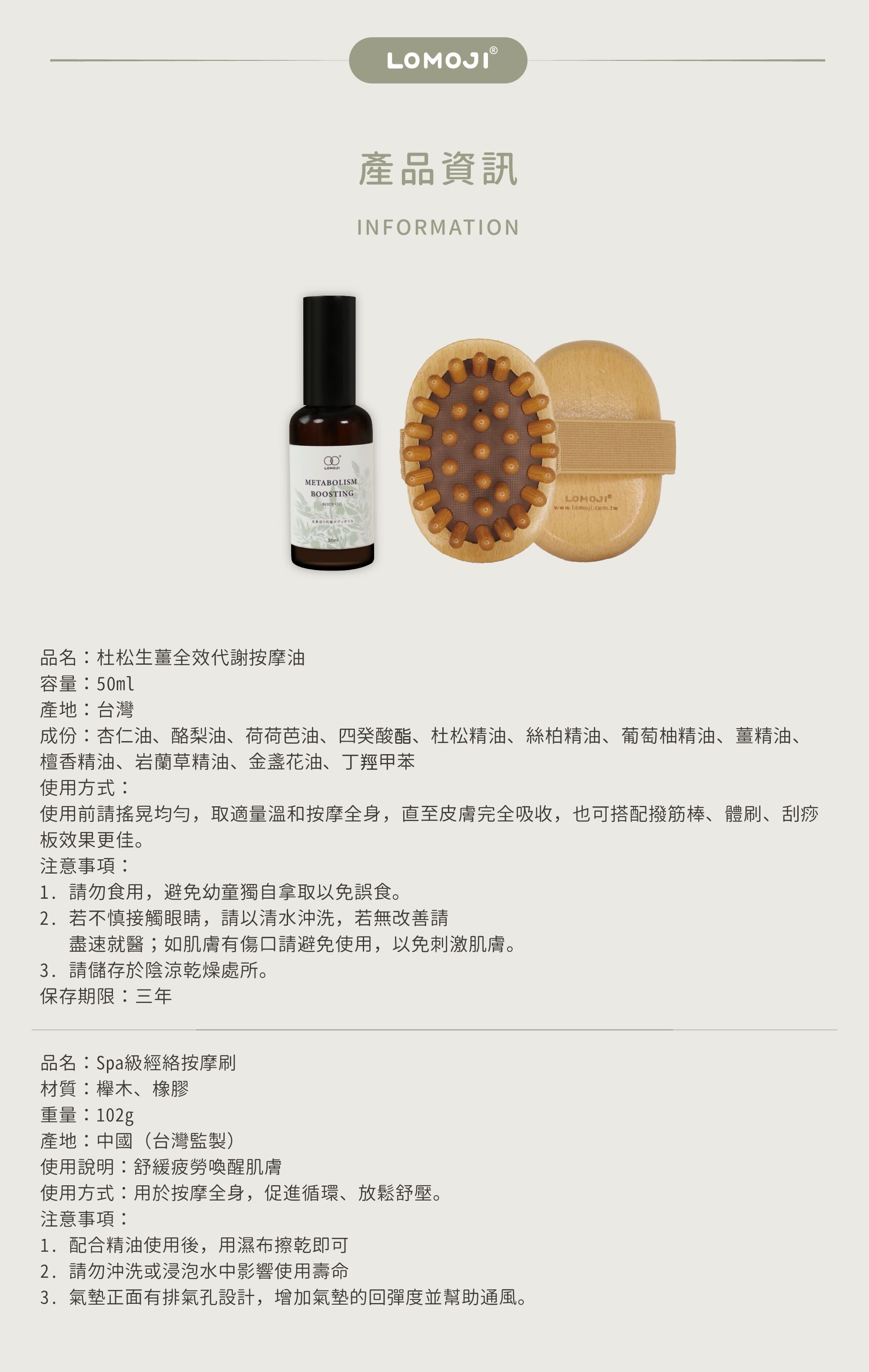 • 代謝配方天然精油:杜松/絲柏/葡萄柚/薑/檀香/岩蘭草