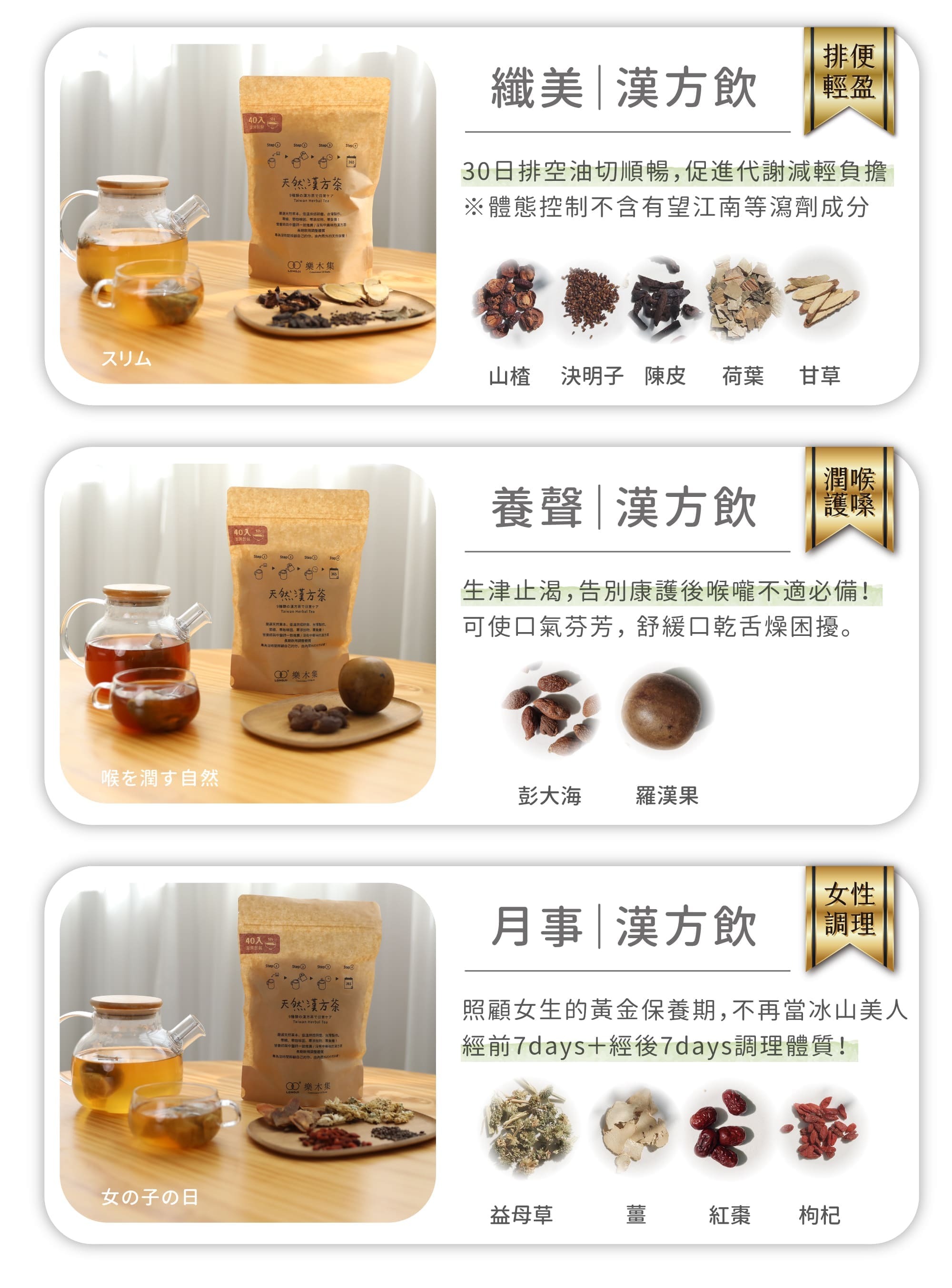 ‧ 每包內含40入漢方養生茶(6~8g x 40入一個月份)