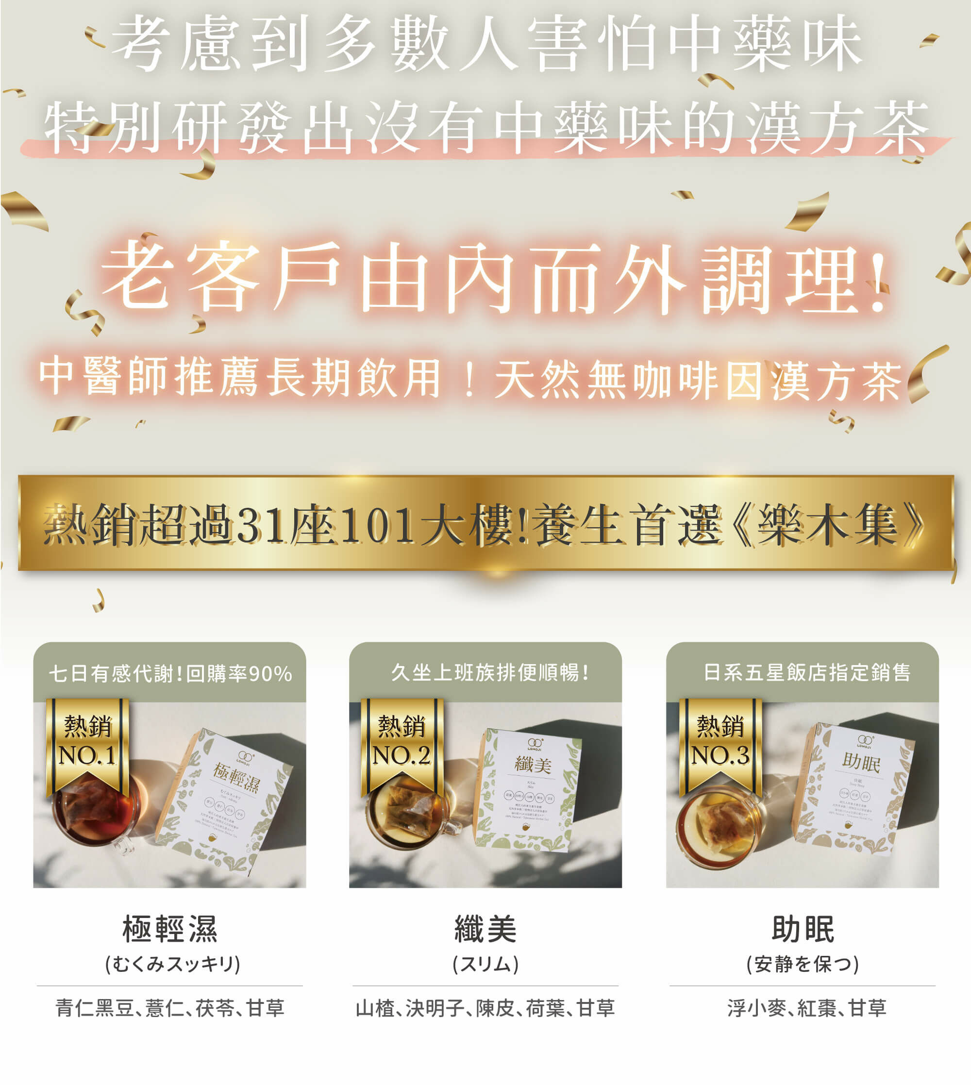 樂木集隱⾝在台北廈⾨街中藥行,傳承老祖宗的漢方智慧,在老祖宗的概念裡食物和養生是相輔相成的,「食療」是日常透過茶飲、膳食來作為平日保健養生的一種方式,但漢方茶他並不是藥,沒辦法喝一包就有成效,必須『一天』、『一點』地慢慢累積,一個養生的好習慣經過時間的複利加成,身體的改變一定會有感,100%天然漢方食材,純天然、無咖啡因、無糖,經60°C低溫烘焙研磨製成茶包,不使用任何化學方式處理,將漢方精華鎖進漢材中,免費時熬煮,五分鐘沖泡完成,每包茶包可回沖2~3次,一天兩包輕鬆補足一天喝水量,被網友評為『沒有中藥味的漢方茶』好喝到榮獲食品界米其林『頂級美味獎章,樂木集為中醫師、營養師、藥師、物理治療師一致認同,日本五星渡假酒店指定用漢方品牌,共有九款主題:極輕濕、助眠、纖美、月事、女神、亮妍、明亮、養聲、精神!